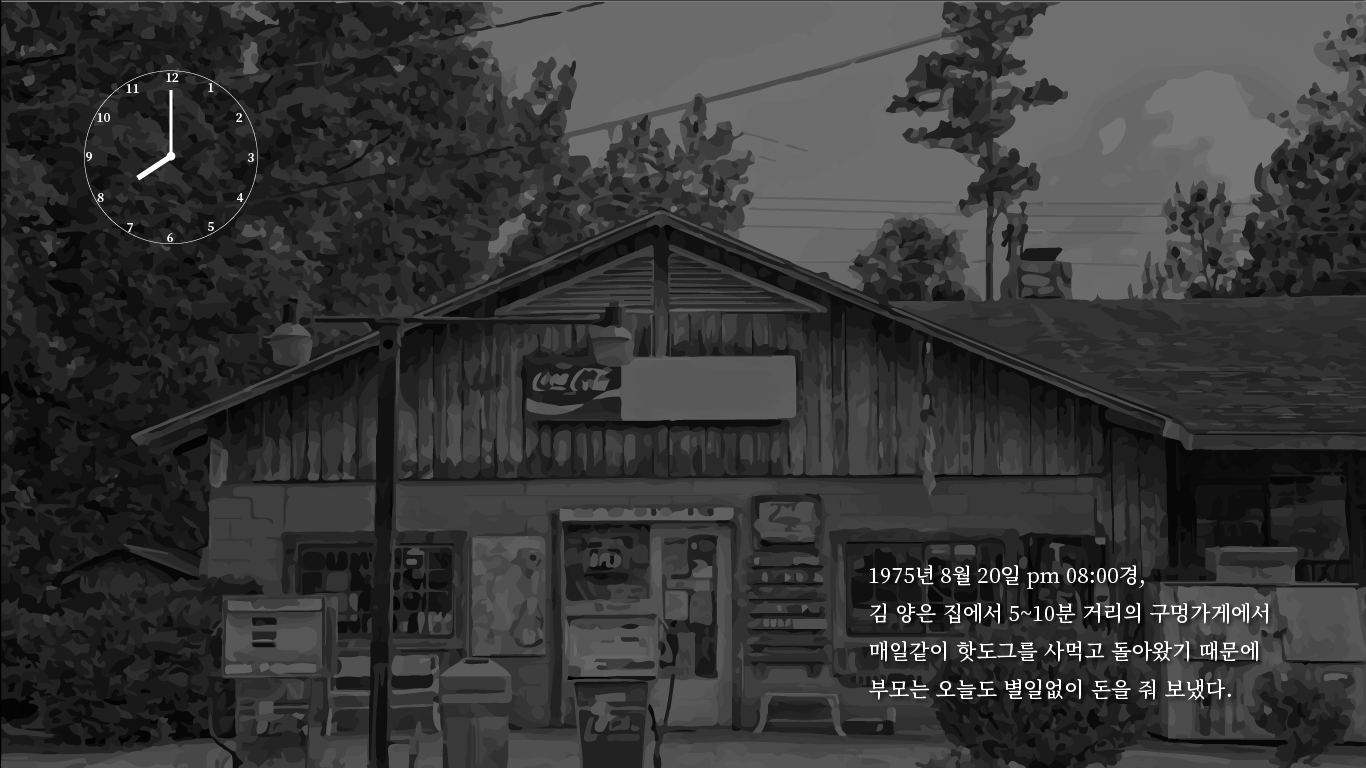 8월 하순이라 아직 해가 떠 있는 시간이고 주택가여서 무모한 범행 불가, 목격자 존재 X 이마와 우측 귀 밑에 심한 타박상 발견. 팬티만 착용한 상태에서 손과 발이 러닝셔츠와 벨트로 묶임. 옷과 신발은 발견되지 않음. |